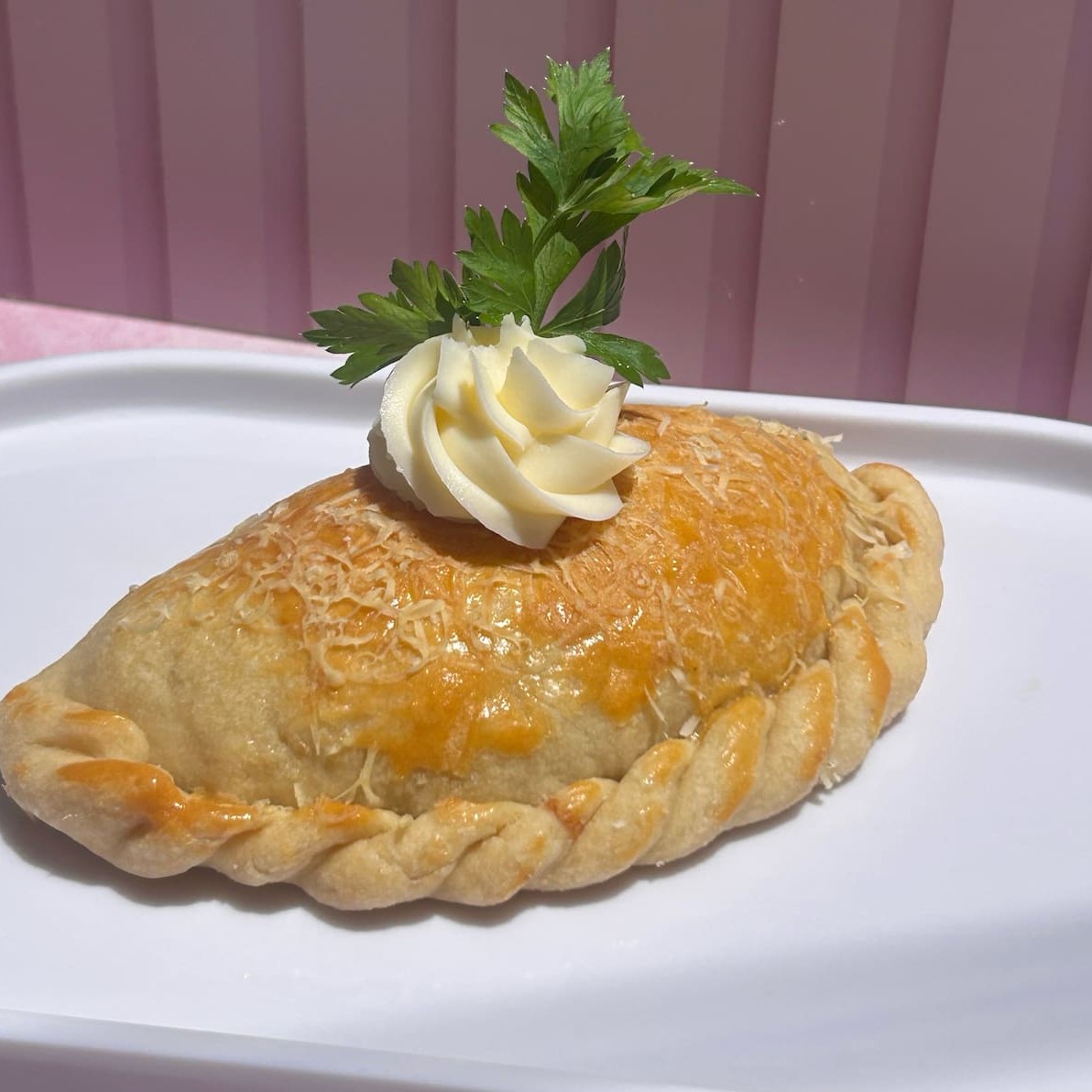 Massa crocante, suculenta que derrete na boca, com recheio de carne seca, banana e creme de queijo, decorada com catupiry e parmesão.
