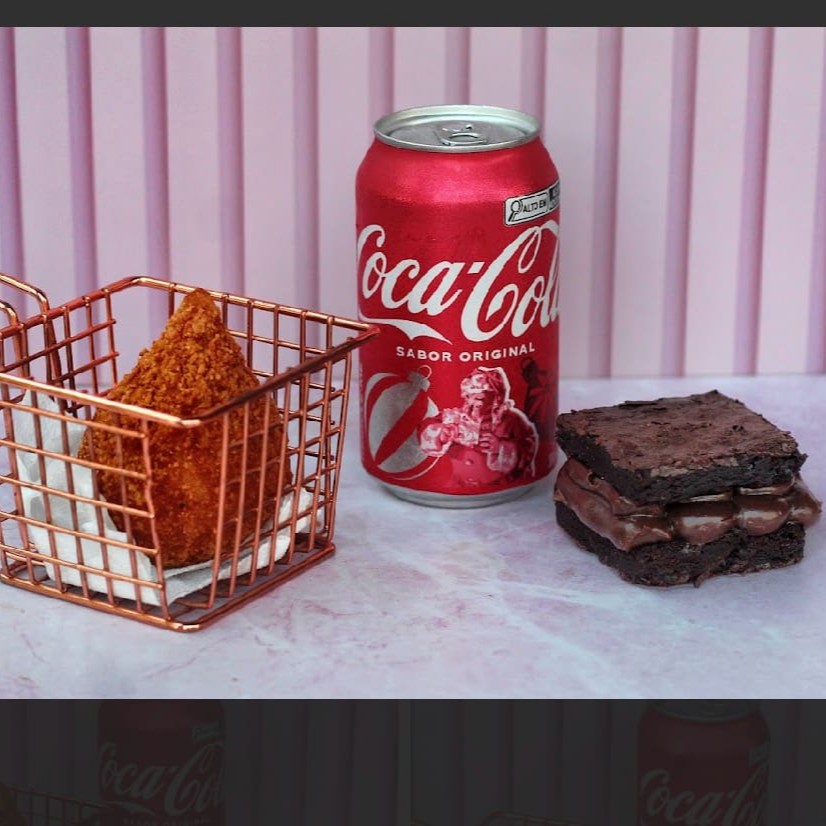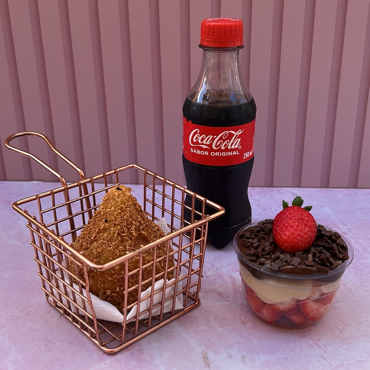 Combo é composto por 1 coxinha de frango -+ coxia cola super gelada, brownie saboroso Caaquinha crocante com recheio de brigadeiro suculento.