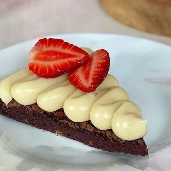 Fatia brownie molhadinho com casquinha crocante , cobertura de ninho com geleia artesanal de morango, decorado com morango fresco.