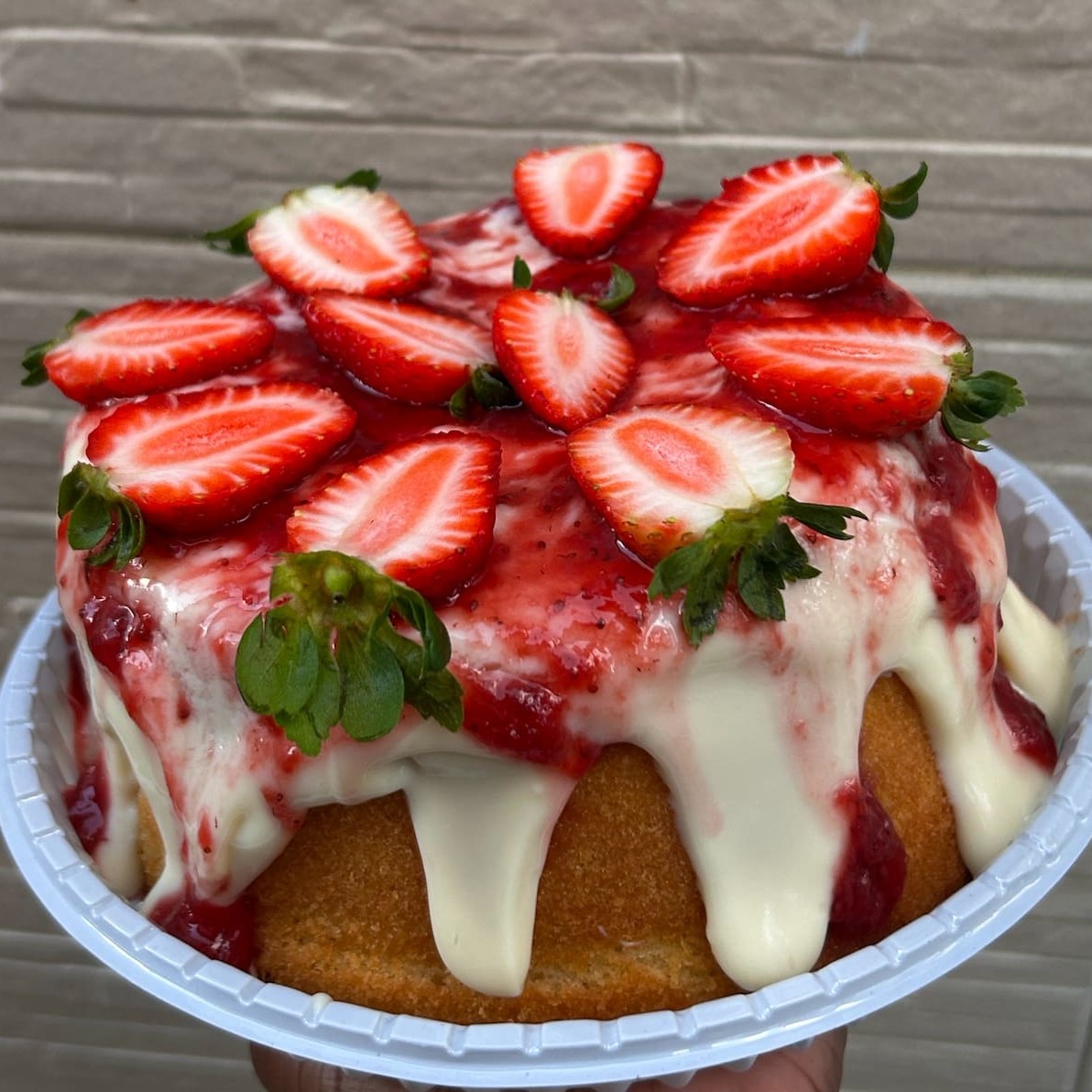 Massa amanteigada, fofinha, molhadinha com cobertura de Ninho e geleia de morango, finalizado com morango frescos e.serve até 6 a 8 pessoas aproximandademente 1kg