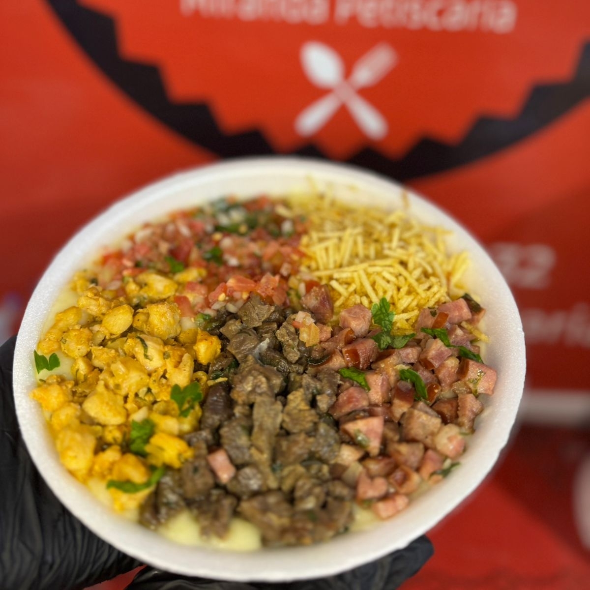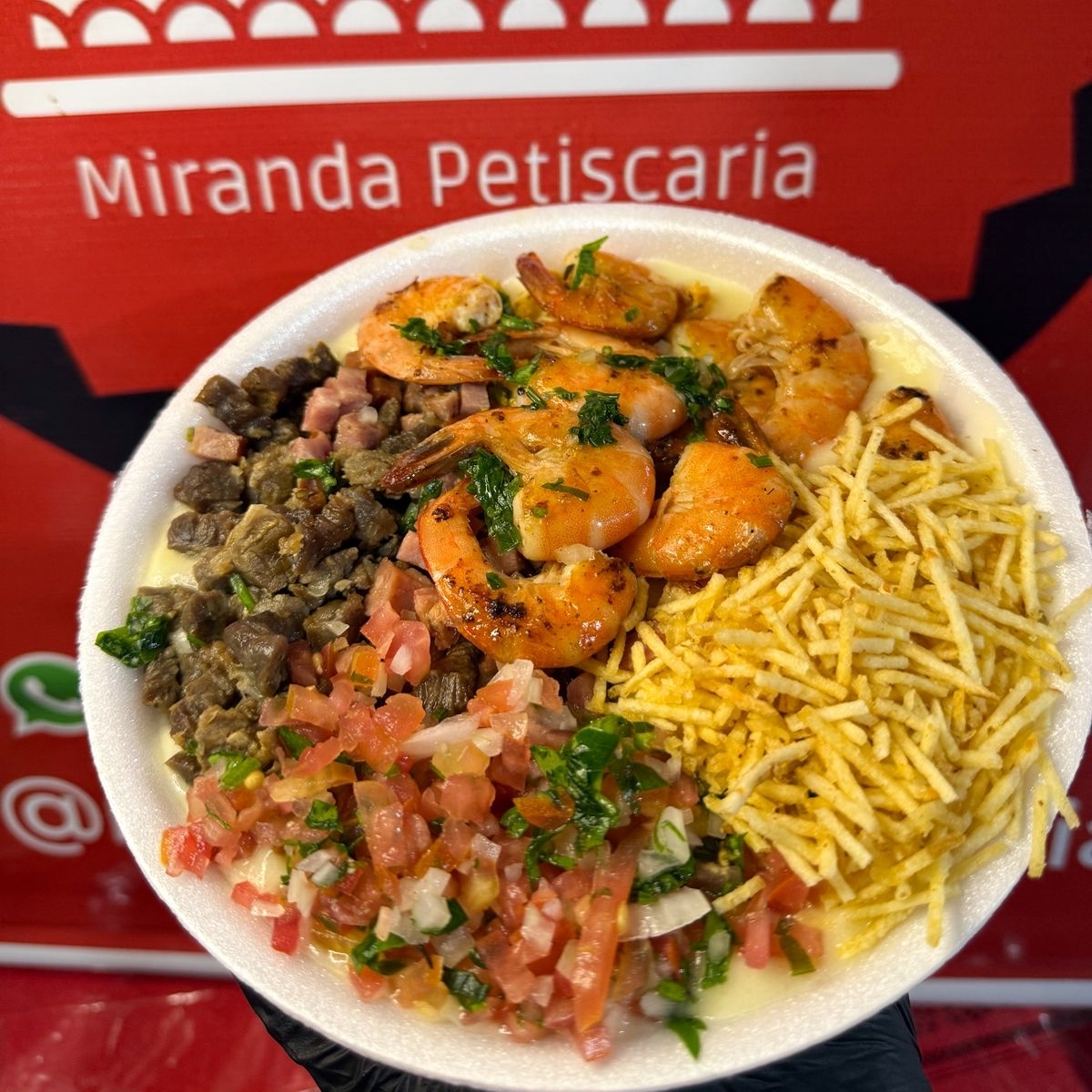 Carne do sol, calabresa, frango, camarão, batata palha e vinagrete