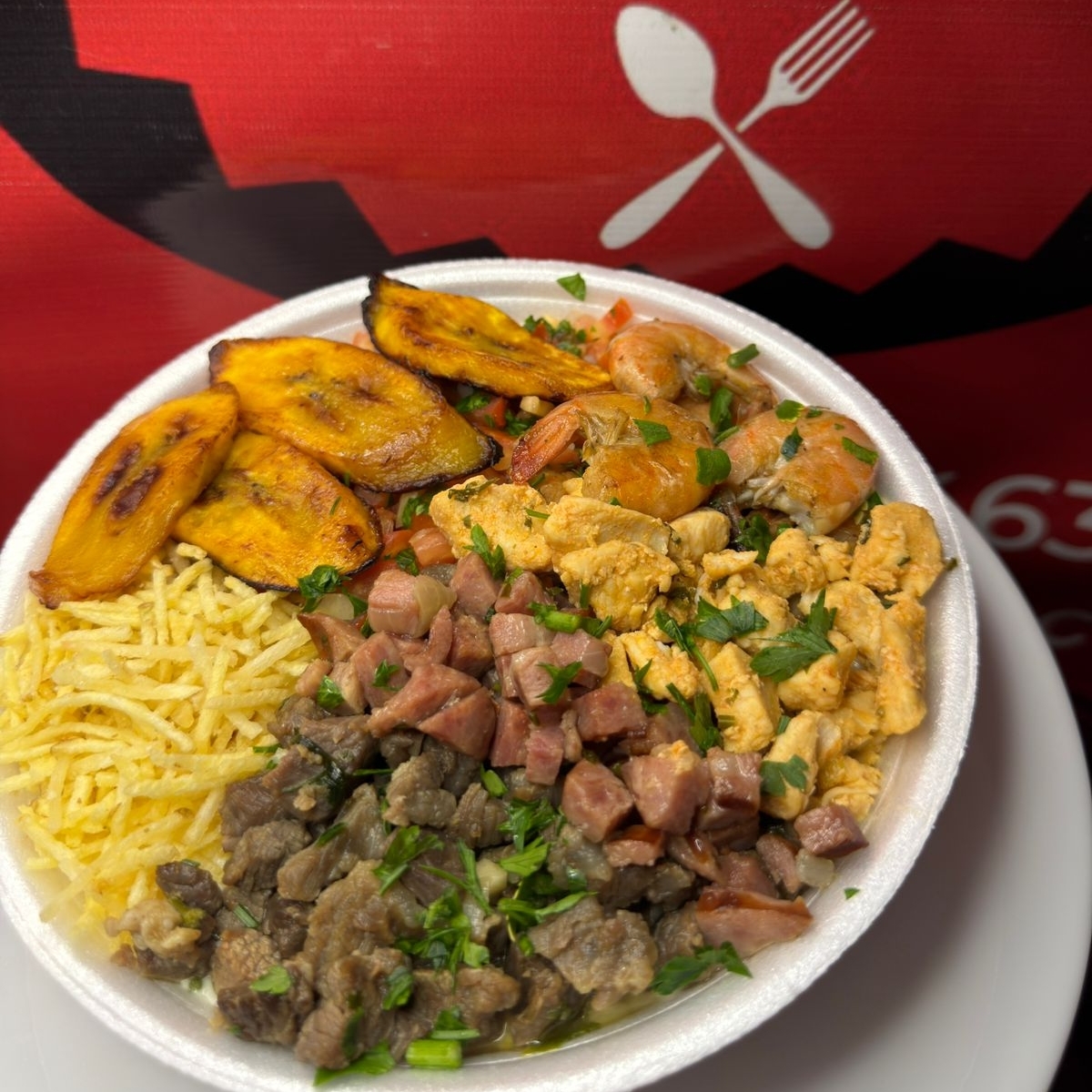 Carne do sol, calabresa, frango, camarão, banana da terra, batata palha e vinagrete