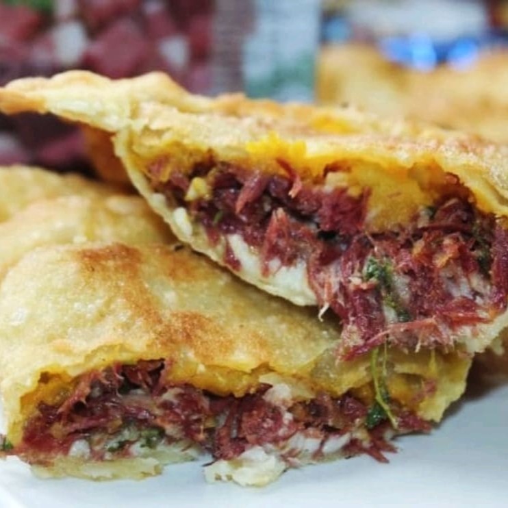 Pastel recheado com carne do sol desfiado, pirão de aipim, mussarela e catupiry. Uma explosão de sabores!