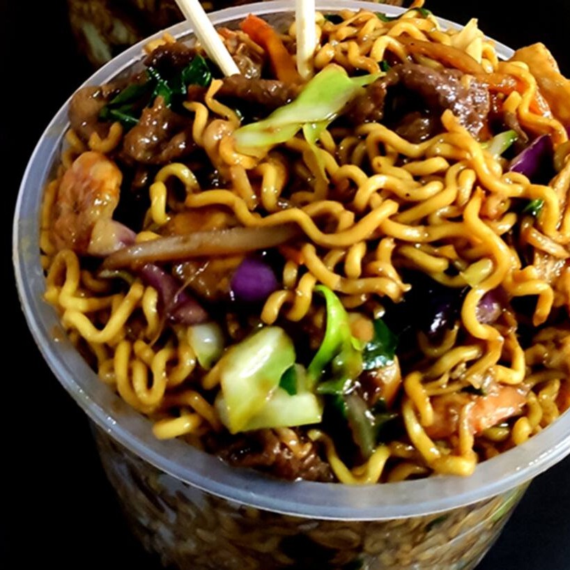 Yakisoba Frango com Carne (apx. 500 g), 1 rolinho primavera, 1 refrigerante lata (Guaraná ou Fanta 350 ml)