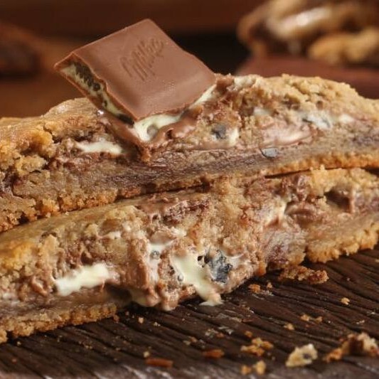 Nossa massa tradicional com gotas de chocolate, recheado com muuuito chocolate Milka Oreo!