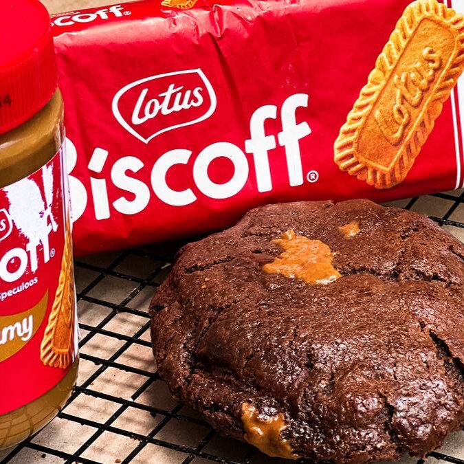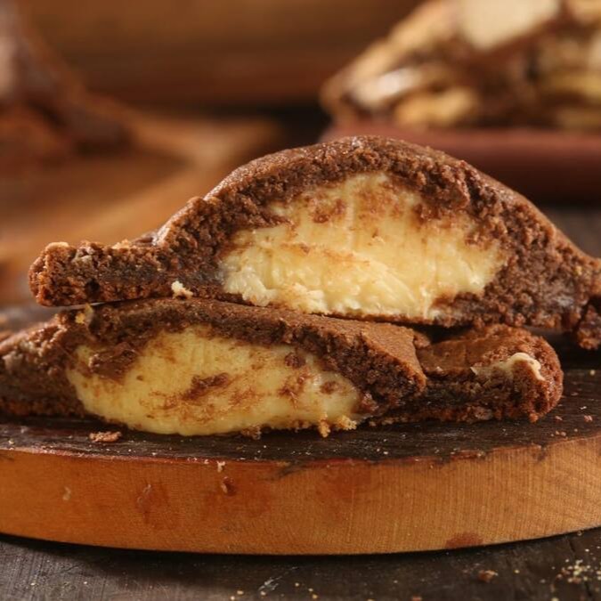 Nossa massa especial cacau com gotas de chocolate meio amargo! Com um super recheio cremoso e crocante do Biscoff Cream.