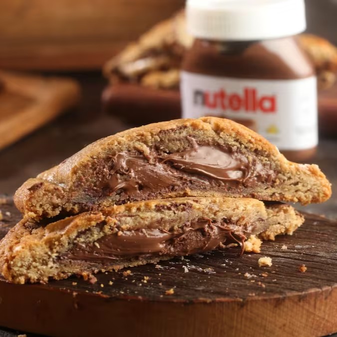 Nossa massa especial Monster Cookie trazendo um cookie crocante por fora e molhadinho por dentro, com um mega recheio de Nutella.