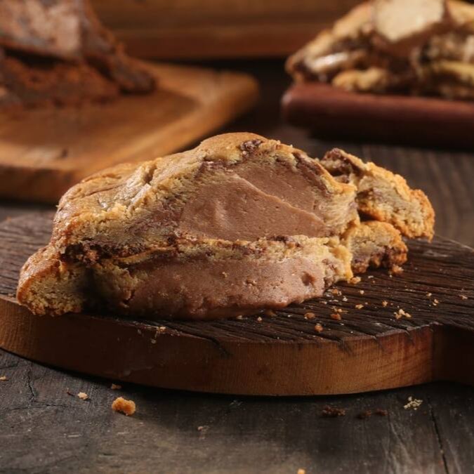 Nossa massa especial Monster Cookie trazendo um cookie crocante por fora e molhadinho por dentro, com um mega recheio de Nutella