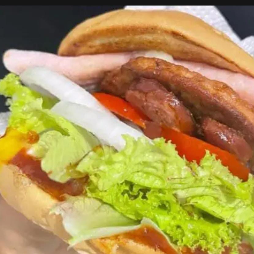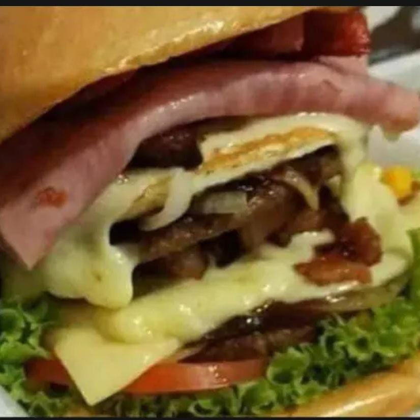Pão de hamburger , duas saladas,2 carne ,queijo,presunto,calabresa,bacon,ovo