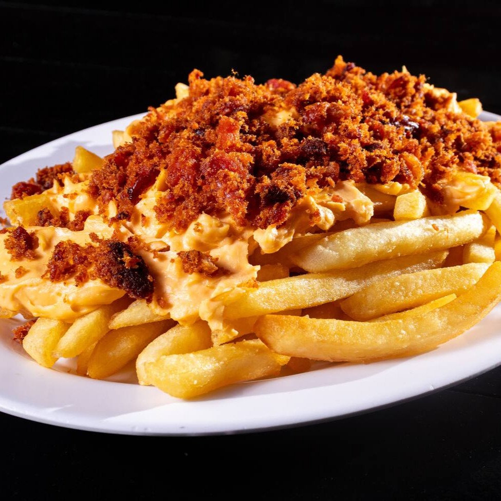 250g de batatas super crocantes, nosso delicioso cheddar da casa e nossa farofa de bacon super sequinha e saborosa.
