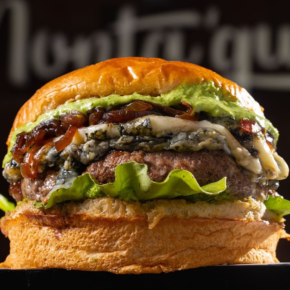 Pão de batata, blend da casa (90g), molho gorgonzola, cebola caramelizada e rúcula.