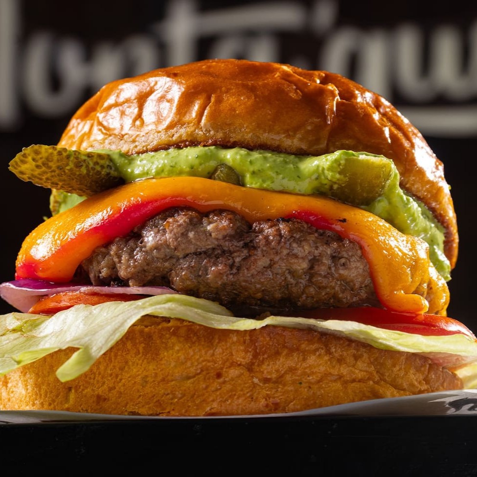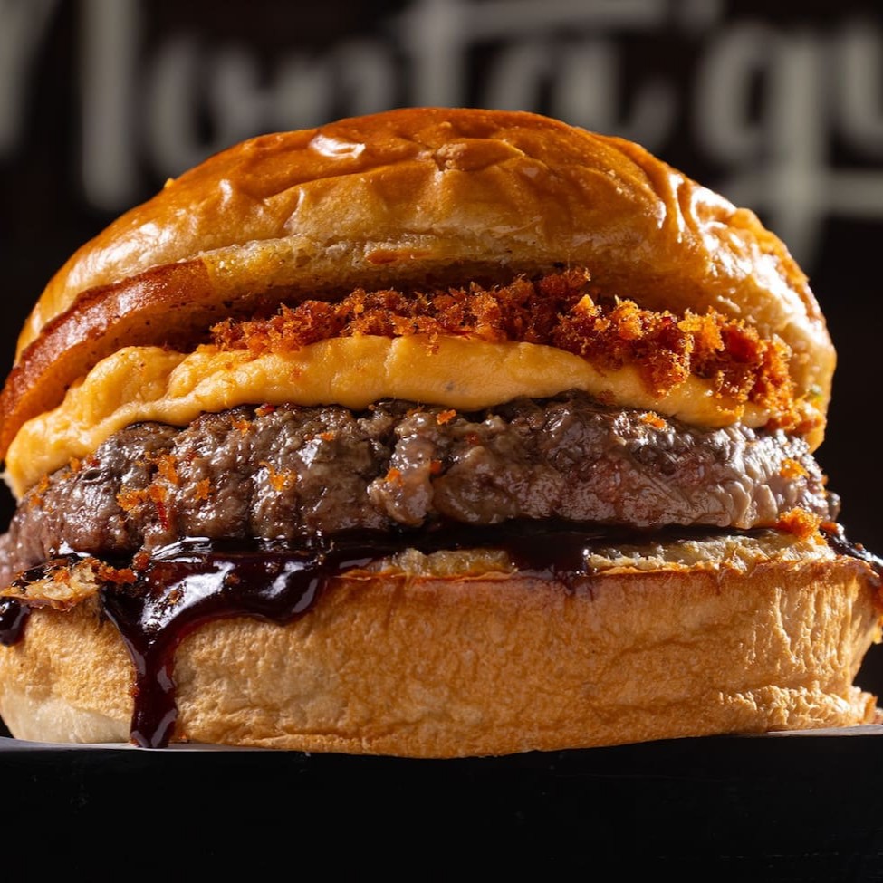 Pão de Batata, blend da casa (90g), queijo cheddar da casa, molho chilli, molho sour cream e nachos.