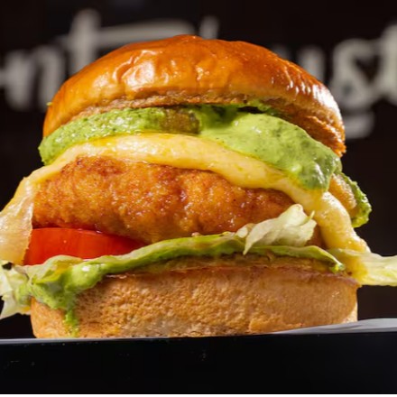 Pão de batata, blend de frango empanado (120g), queijo mussarela, alface americana e maionese de cebola defumada.