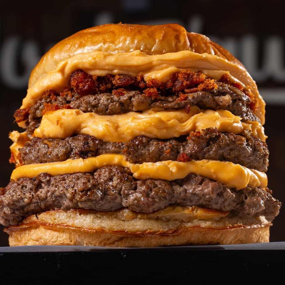Pão de batata, três blends da casa de 90g (270g), queijo cheddar da casa e farofa de bacon.