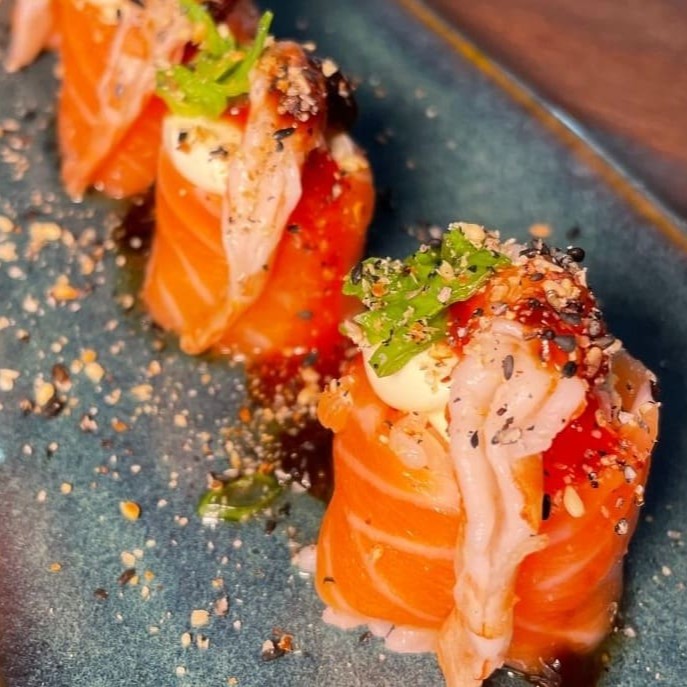 Uramaki de salmão cru com cream cheese, coberto com salmão e brie maçaricado, finalizado com farofa crocante de panko e gergelim moído. Cremoso e irresistível!
