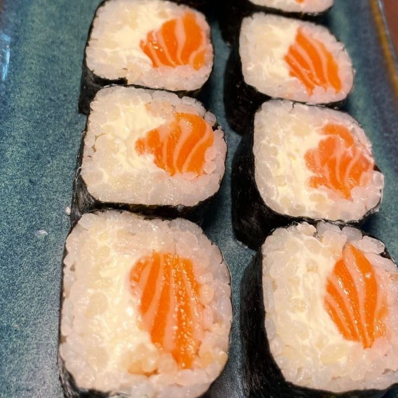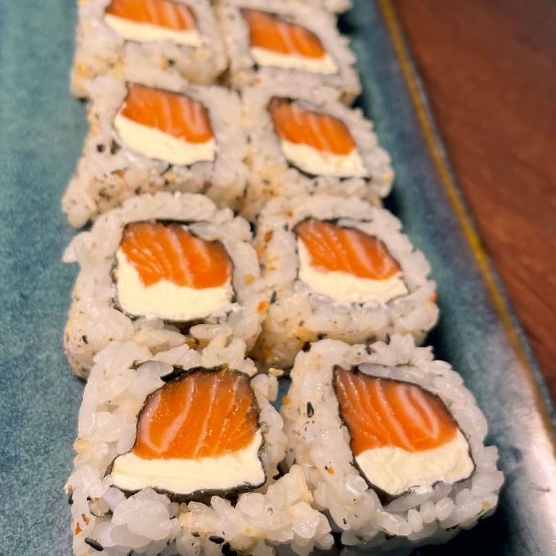 Delicioso hossomaki de salmão cru com cream cheese, super cremoso.
