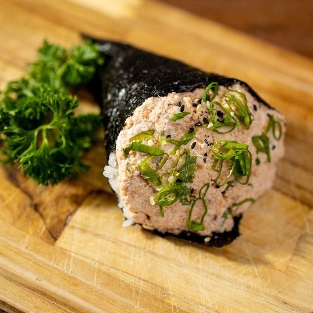Cone de alga recheado com arroz japonês, pastinha de salmão grelhado, cebolinha e gergelim moído. Cremoso e saboroso.