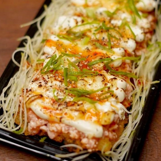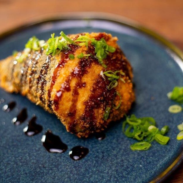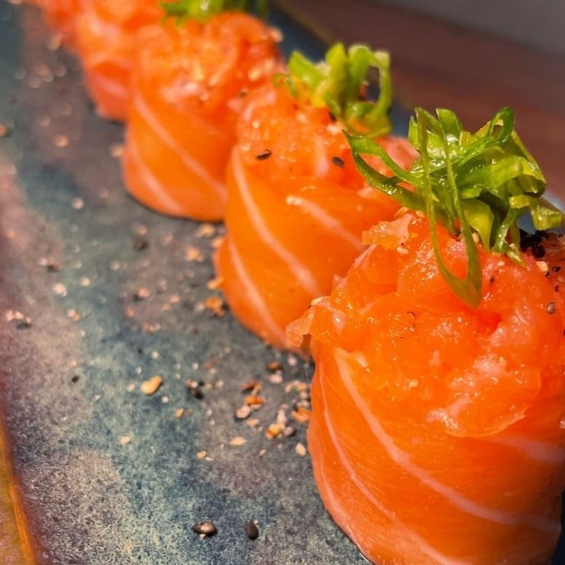 Recheio de pastinha de salmão grelhado, cream cheese, alho-poró sobre arroz japonês, empanado e finalizado com geleia de pimenta e molho teryaki. Sabor marcante e envolvente.