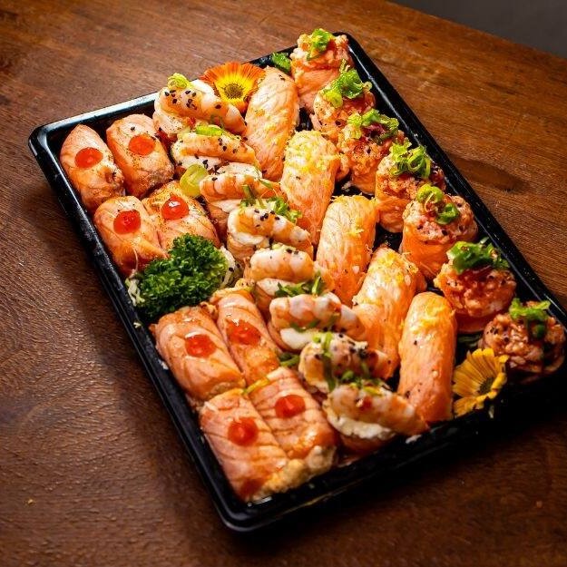 Contém 28 peças: Especial De Salmão Grelhado Maçaricado Especial Salmão C Camarão Maçaricado Joe C/ Camarão Maçaricado Niguiri Trufado C Raspa De Limão Siciliano Maçaricado Joe C/ Patê De Salmão Maçaricado