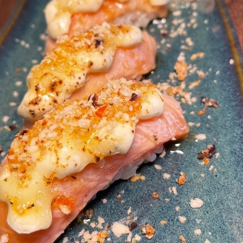 Niguiri de salmão maçaricado com queijo brie, finalizado com farofa especial de panko crocante e geleia de pimenta.