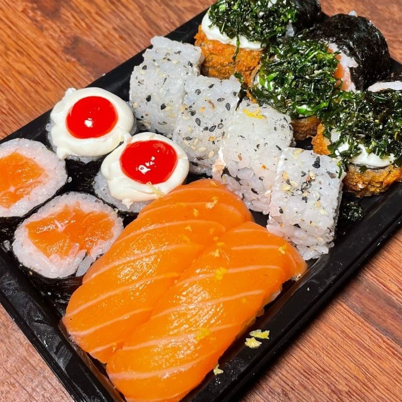 16 Peças: 2 Hossomaki salmão cru 2 Hossomaki c/ geleia de rubras 2 niguiri c raspa de limão siciliano 4 uramaki de salmão grelhado 3 hot com couve crispy 3 hossomaki de camarão Acompanha: 2 tarê, 2 shoyu e 1 hashi