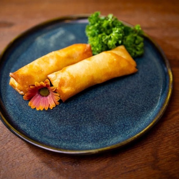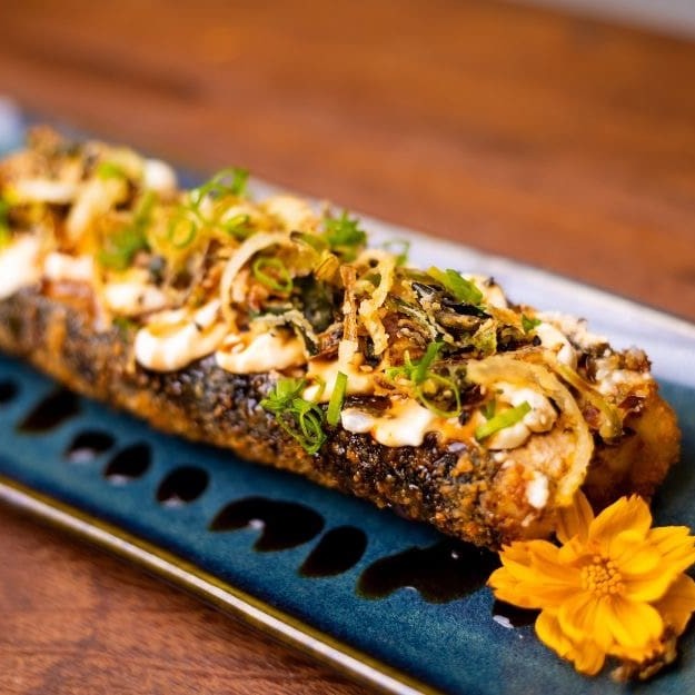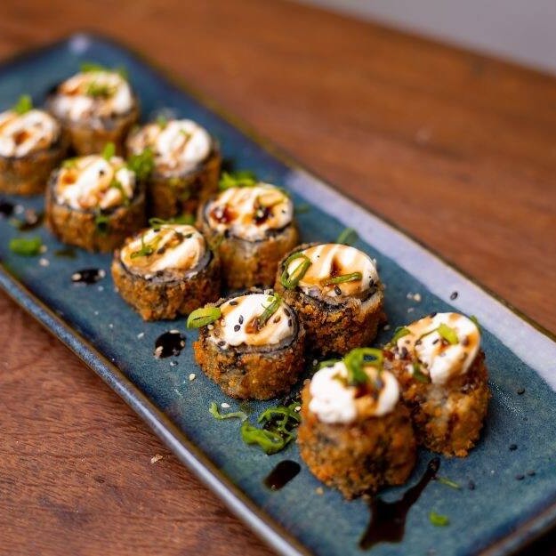 Temaki empanado e frito, recheado com arroz, pastinha de salmão grelhado, camarões, cebolinhas e fios de molho teriaki. Sabor intenso e textura perfeita.