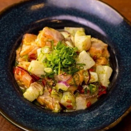 Cubos frescos de salmão e tilápia marinados no sumo de limão e laranja, com cebola roxa, tomate cereja, pimenta dedo de moça e toque de ervas. Uma explosão cítrica e refrescante!