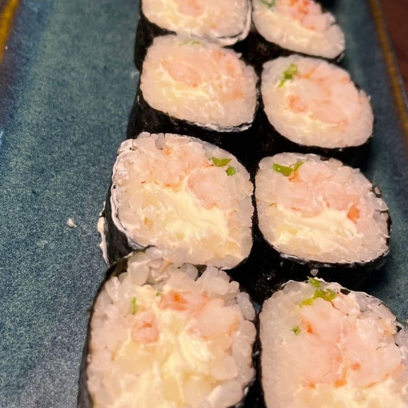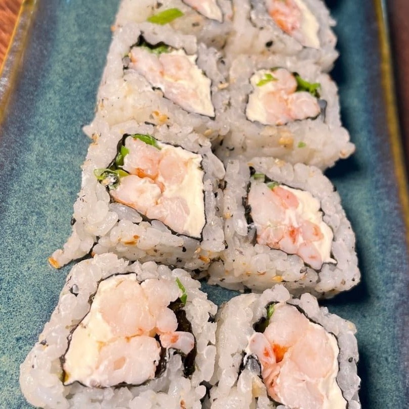 Delicioso hossomaki de camarão com cream cheese e cebolinha, super cremoso.