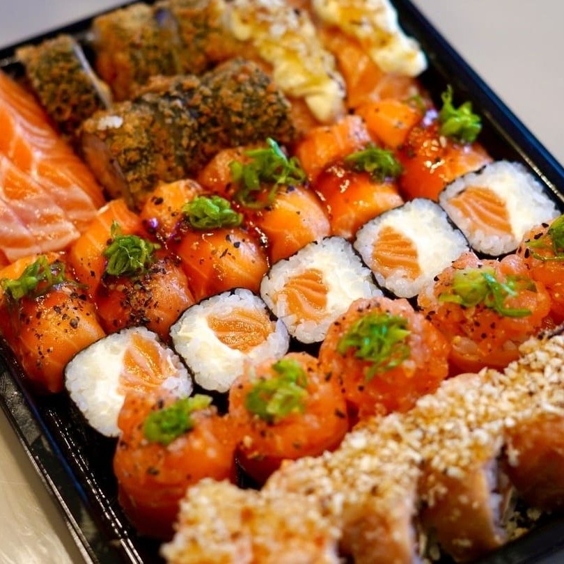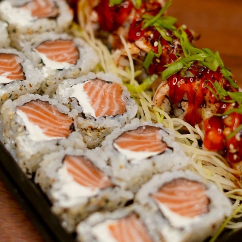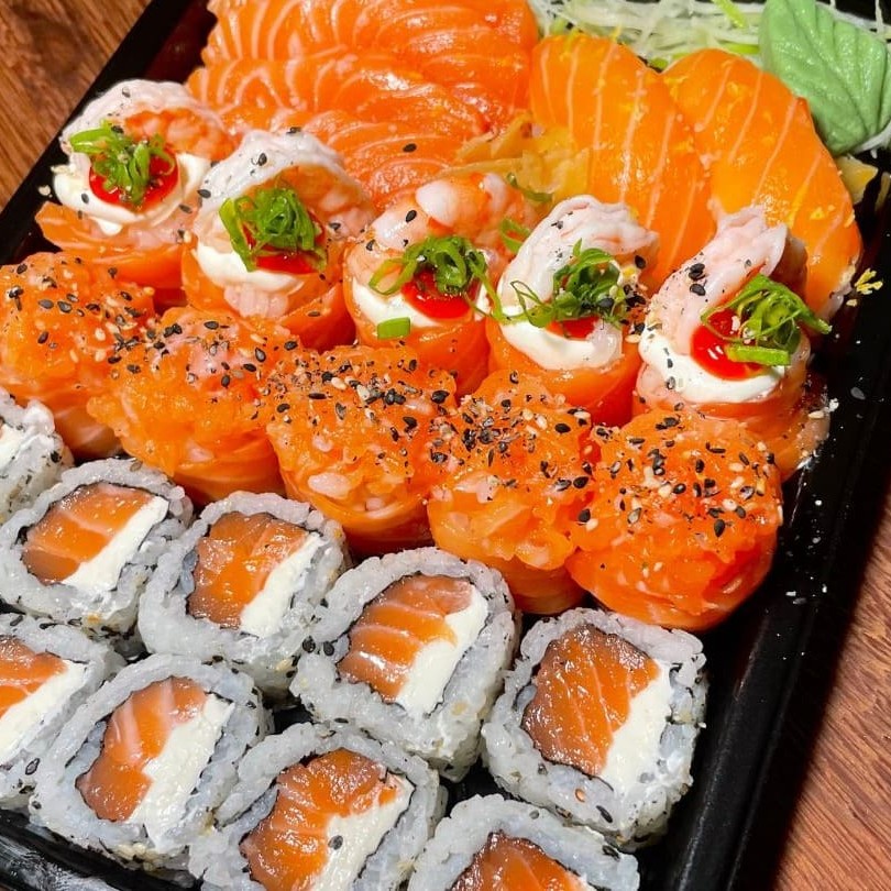 Salmão fresco em cubos, camarões selecionados, cream cheese, cebolinha e gergelim moído sobre arroz japonês, envoltos em alga. Um sabor completo do mar.
