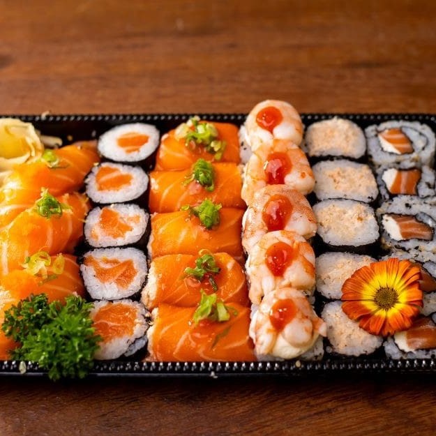 Contém 28 peças: Niguiri De Salmão, Uramaki Salmao Cru Hossomaki De Salmao Grelhado Uramaki C/Camarao Especial De Salmão Grelhado Hossomaki Salmao Cru