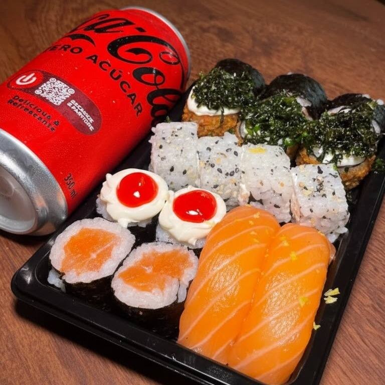 16 Peças + 1 Coca Cola Zero 350ml 2 Hossomaki grelhado 2 Hossomaki com geleia de rubras 2 Niguiri com raspa de limão siciliano 4 Uramaki com salmão grelhado 3 Hot com couve crispy 3 Hossomaki de camarão Acompanha : 2 tarê, 1 shoyu e 1 hashi