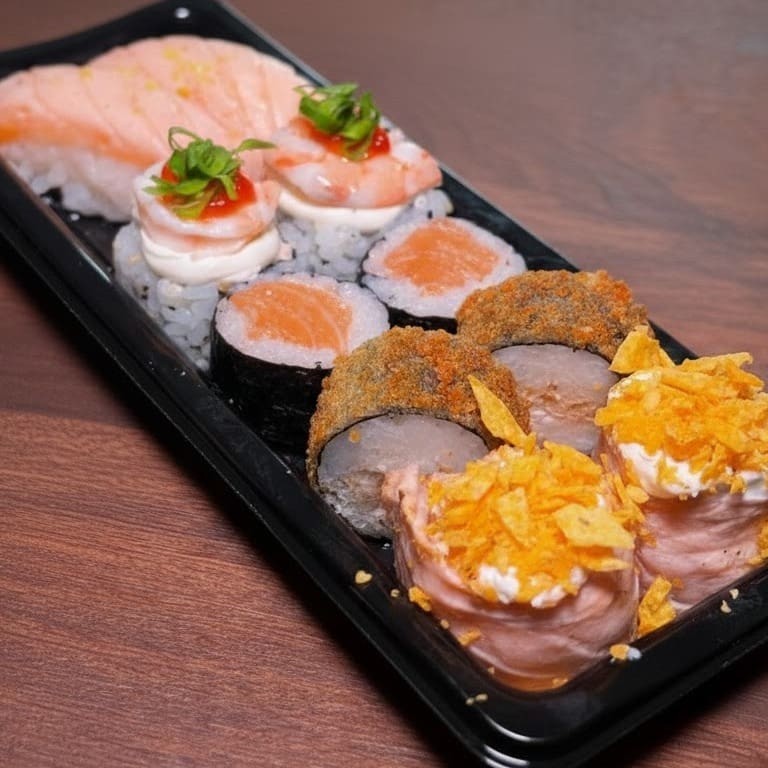 CONTÉM: 10 Peças: 2 Joe Com Cream Cheese E Doritos 2 Uramaki Com Camarão 2 Hossomaki Com Salmão Cru 2 Hot Filadelfia 2 Niguiri Massaricado C/ Raspa De Limão Siciliano Acompanha: 1 Hashi, 1 Tarê E 1 Shoyu
