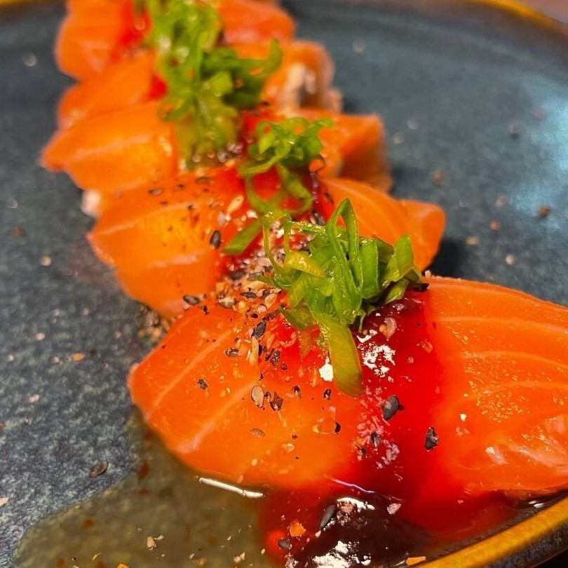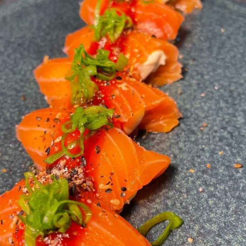 Especial de salmão grelhado com cream cheese, molhos especiais, finalizado com gergelim moído e cebolinha.