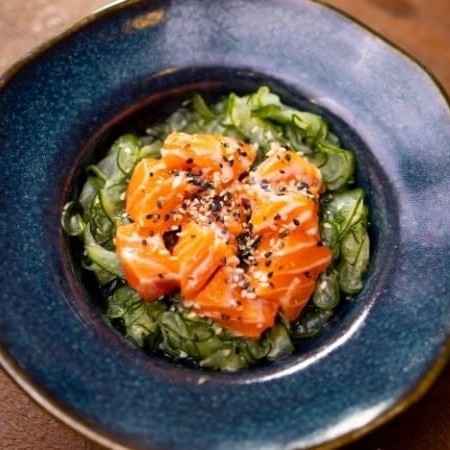 Cubos de salmão fresco servidos sobre finas lâminas de pepino japonês temperado com molho agridoce à base de vinagre de arroz, e gergelim moído. Uma entrada leve, refrescante e cheia de sabor. Serve 1 pessoa