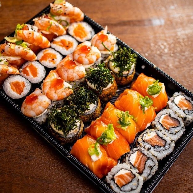 Contém 30 peças: Uramaki Salmao Cru Hossomaki Salmao Cru Joe C/ Camarão Uramaki C/Camarao Especial De Salmão Grelhado Hot Filadelfia C/ Couve Crispy