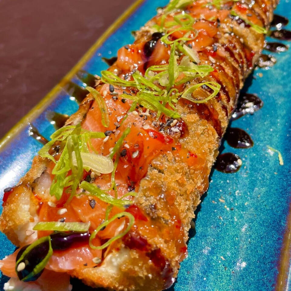 Enrolado empanado e recheado com arroz, salmão fresco em cubos, cream cheese, cebolinha. Finalizado com geleia artesanal de pimenta e teryaki.