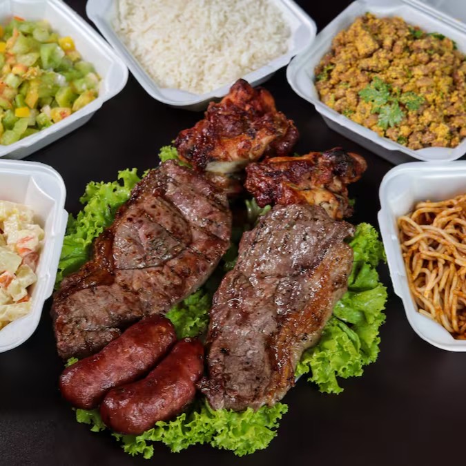 Proteínas: 2 Fatias de Contra Filé Maturado, 1 Fatia de Cupim Maturado, 2 Frangos, 2 Calabresas e 1 Fatia de Costela Suína.