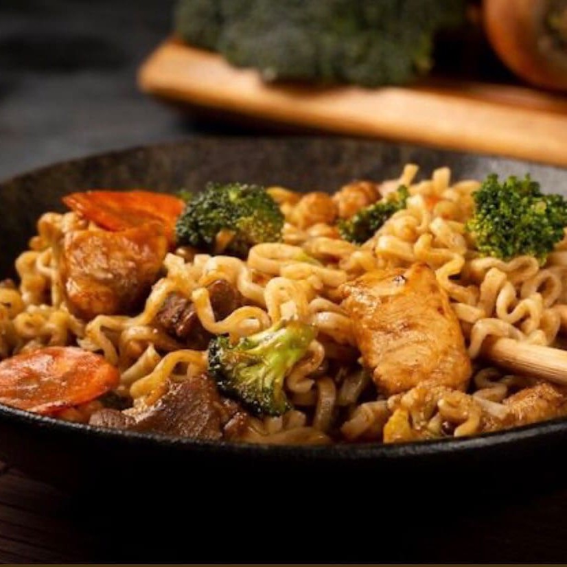 Tiras de frango e Filé, legumes e massa refolgados no molho shoyu e molho do chef. Acompanha 1 sachê de molho Shoyu, 1 Sachê de Agridoce e 1 par de hashi.