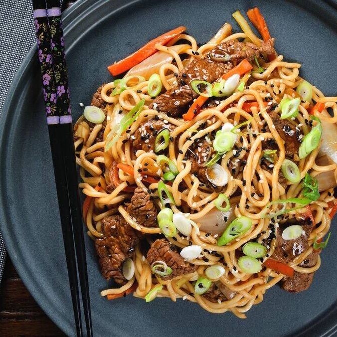 Tiras de filé, Legumes e Massa refolgados no molho shoyu e molho do Chef. Acompanha 1 sachê de molho Shoyu, 1 Sachê de Agridoce e 1 par de hashi.