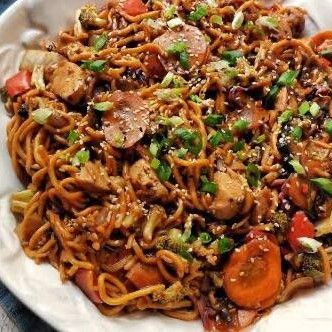 Tiras de Frango, Legumes e massa refolgados no molho shoyu e molho do chef. Acompanha 1 sachê de molho Shoyu, 1 Sachê de Agridoce e 1 par de hashi.