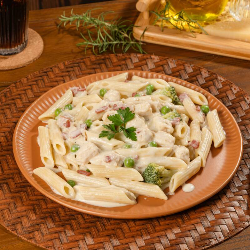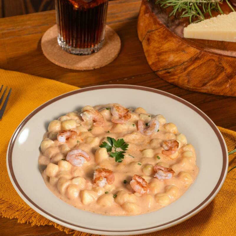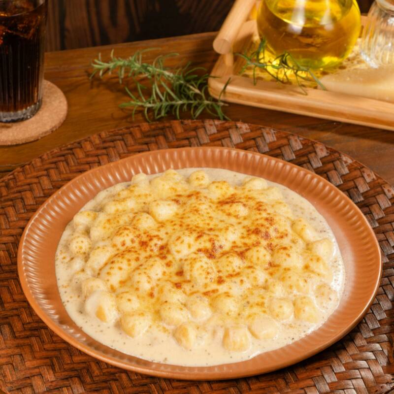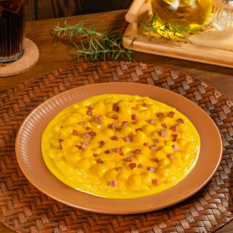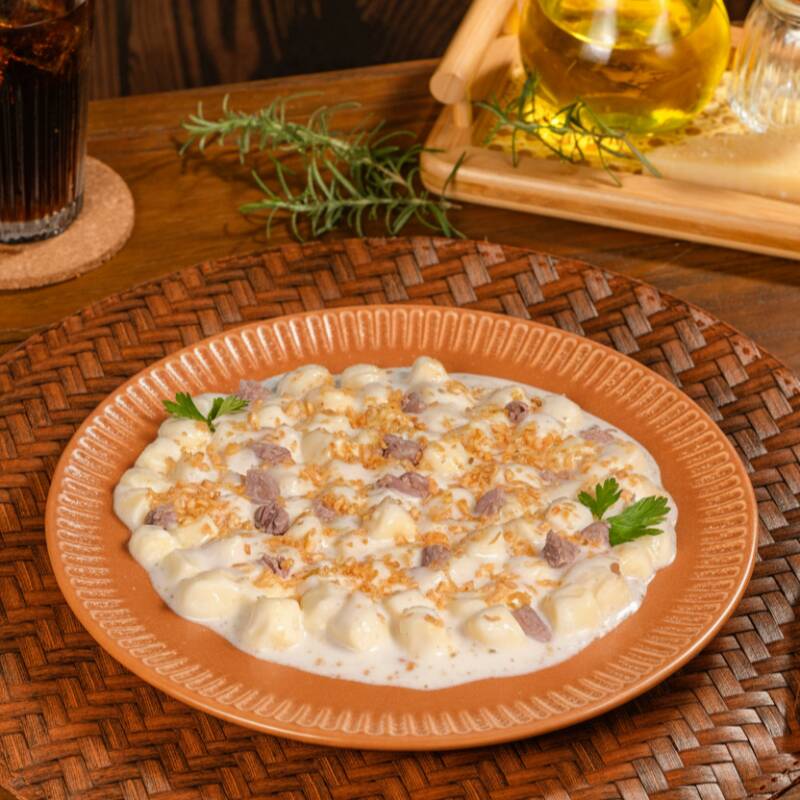 Nhoque de batata cremoso com frango desfiado, ervilha, brócolis e pedacinhos de bacon, tudo envolto em um molho branco suave e delicioso. Uma combinação rica e irresistível!