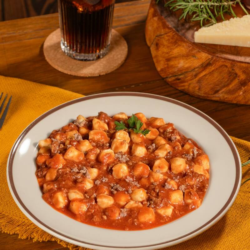 Nhoque de batata com molho bolonhesa feito com carne moída e tomate.
