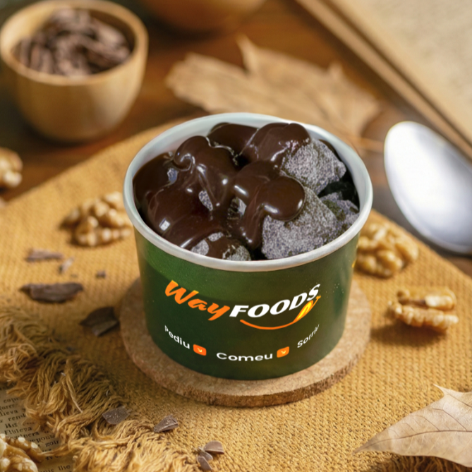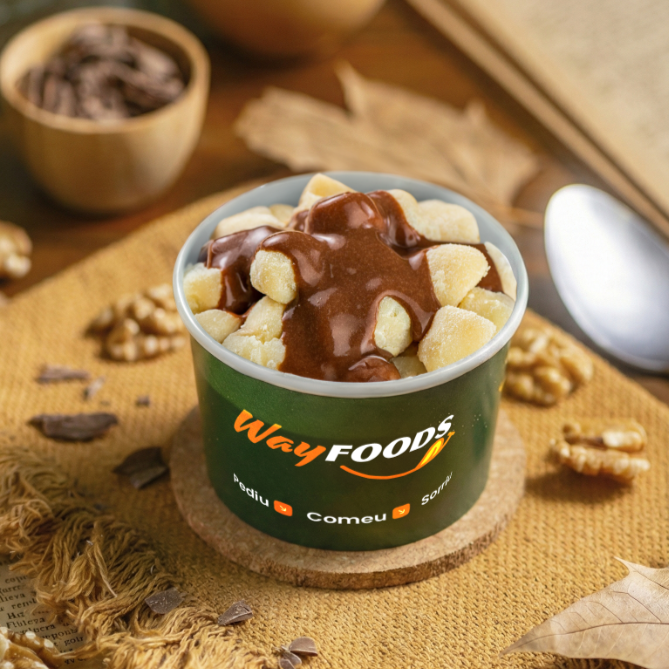 Nhoque delicado e delicioso feito com leite em pó, coberto com uma rica e cremosa ganache de chocolate, proporcionando uma experiência gastronômica doce e irresistível.