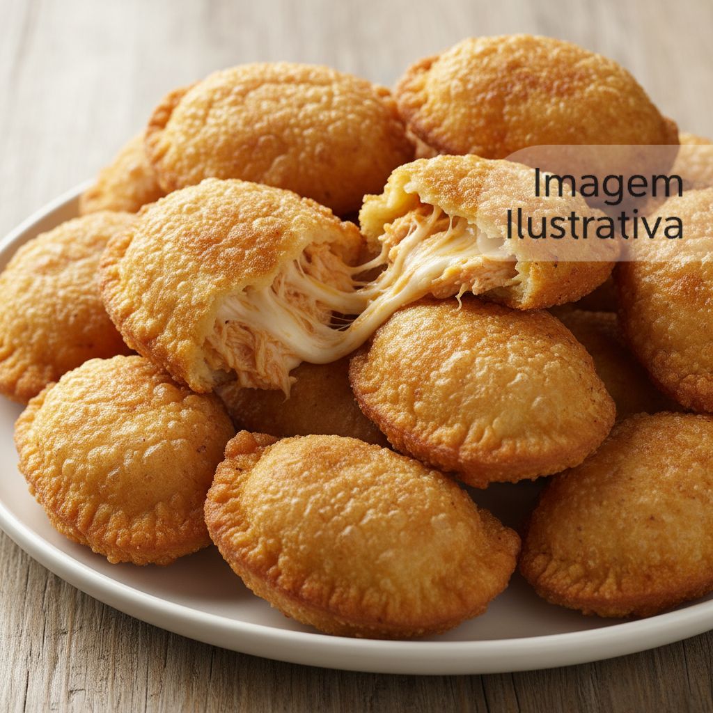 Pastel crocante com recheio de frango temperado e queijo derretido.
