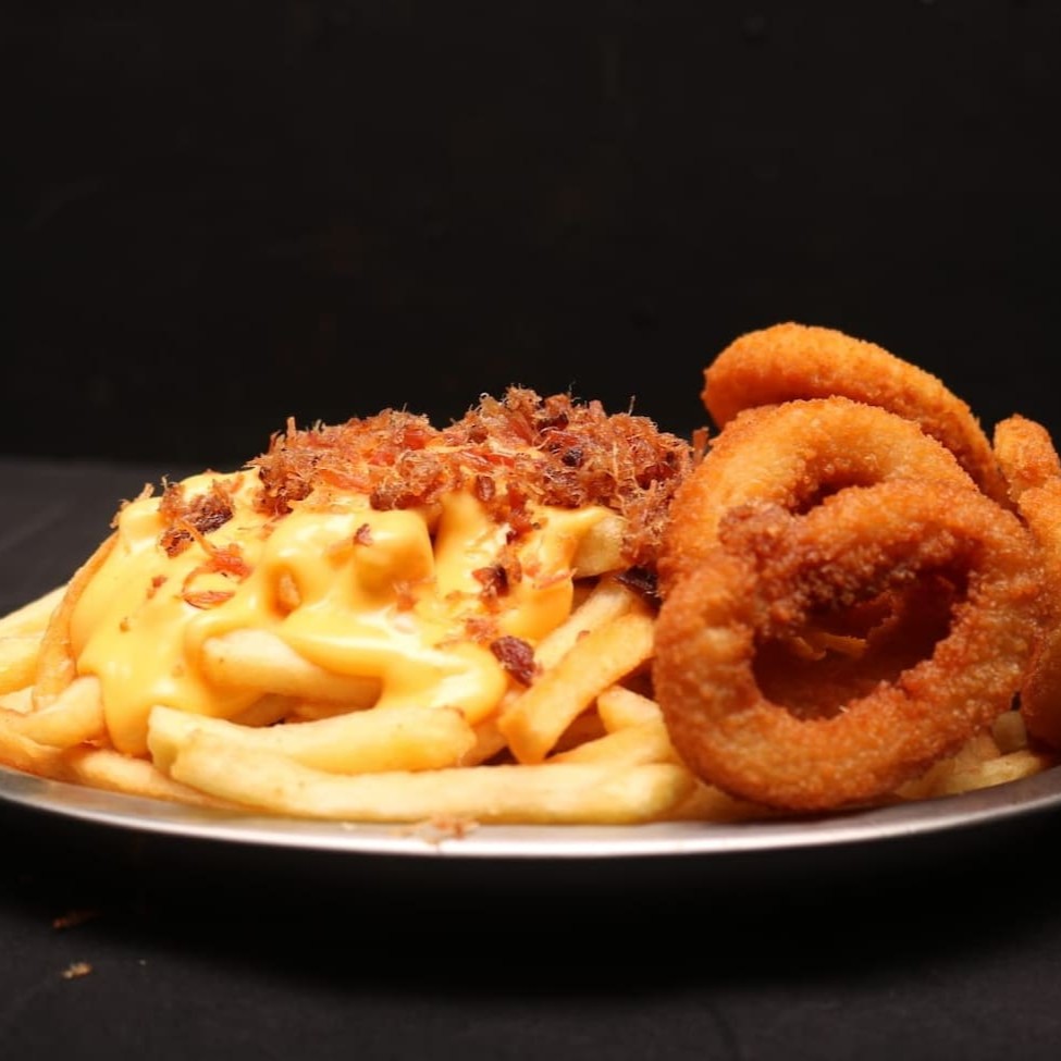 Batata Frita, Onions Rings com Cheddar e Bacon Crocante.