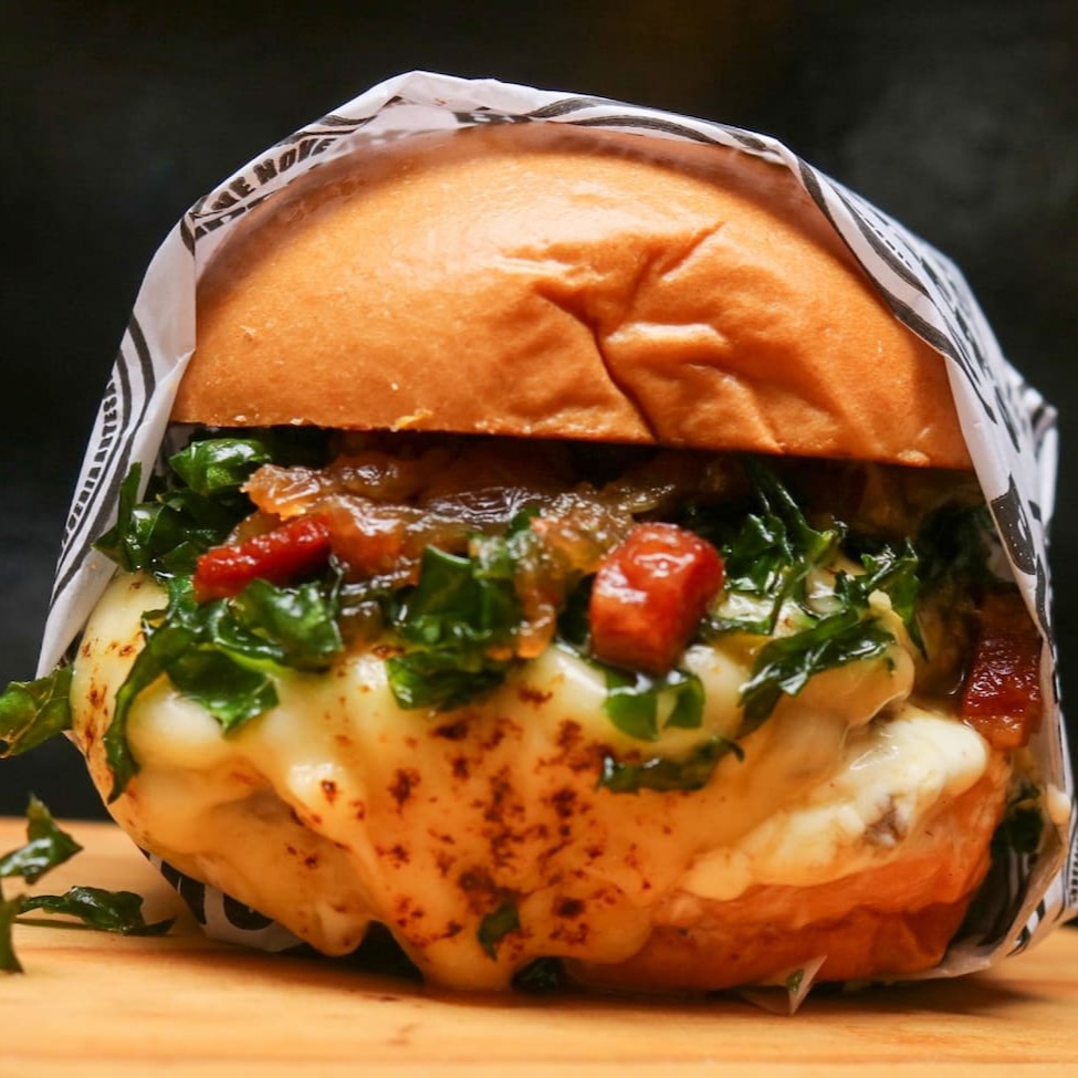 Receita totalmente autoral Desenvolvida pelo Chef, Pão brioche, Maionese especial da casa, Blend de Carne 180g, Queijo coalho maçaricado, Nossa maravilhosa geleia de bacon e Couve Crispy.