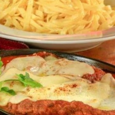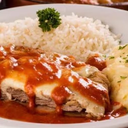 Uma combinação que conquista todos os paladares! Filé de frango ou carne empanado, crocante por fora e macio por dentro, coberto com nosso molho de tomate caseiro e uma generosa camada de queijo derretido. Acompanha arroz branquinho soltinho e batatas fritas douradas e sequinhas. Um prato completo, clássico e irresistível!