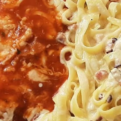 Parmegiana com Massa à Carbonara (Para 2 pessoas)