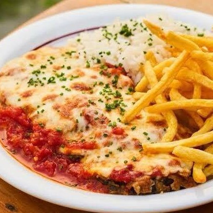 Deliciosa parmegiana de Frango ou carne empanado na farinha panko com maravilhoso molho de tomate caseiro especial da vovó, acompanhado de arroz branco soltinho e batata frita.