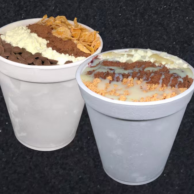 2 Potes de 360 ml de isopor Térmicos com Açaí e 4 Acompanhamentos grátis em cada copo.